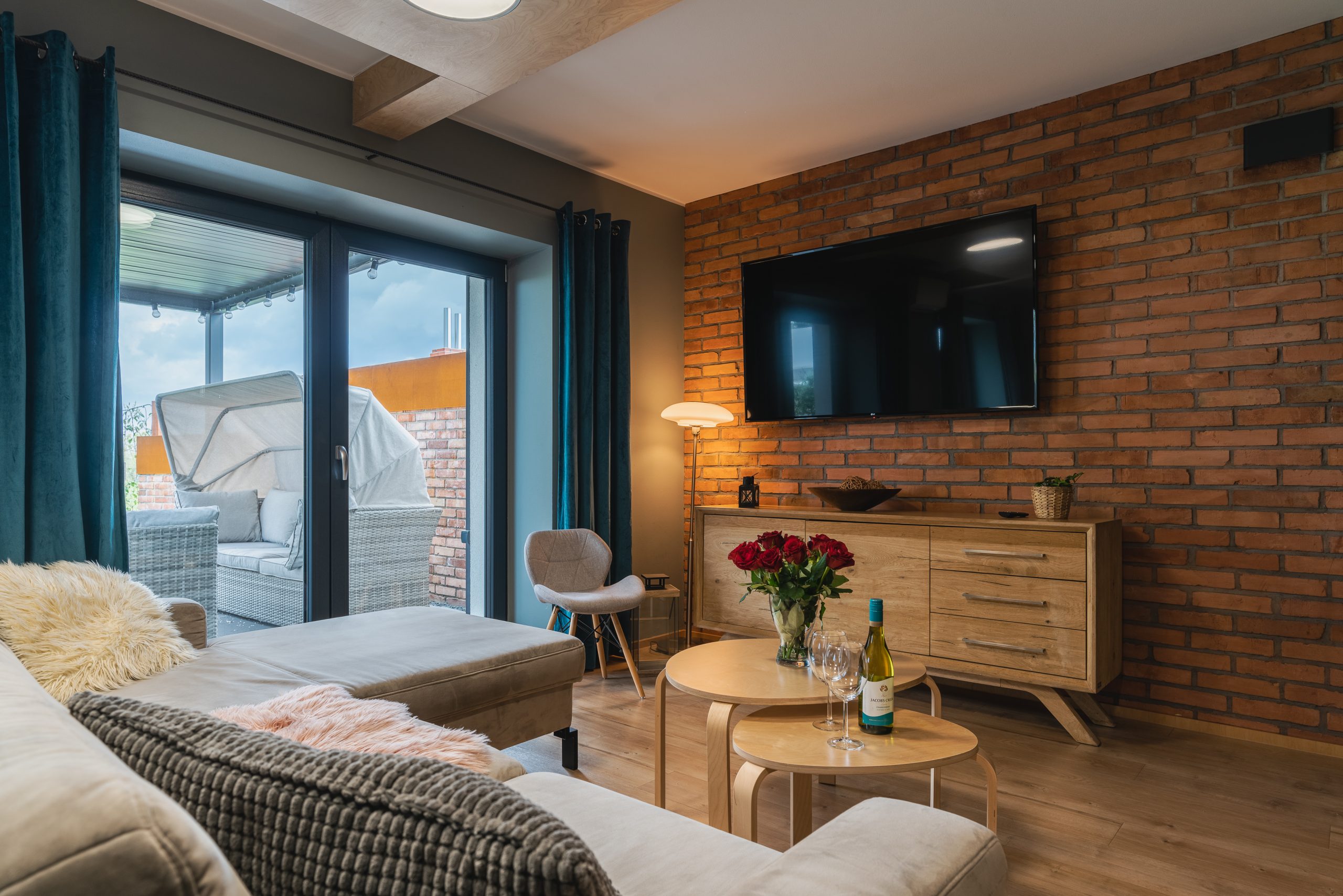 Wyjątkowym atutem apartamentu jest przestronny taras, który otwiera przed Tobą możliwość relaksu na świeżym powietrzu. Zadaszona przestrzeń z wygodnymi, nowoczesnymi meblami ogrodowymi zapewnia komfort niezależnie od pogody. Wieczorem taras rozświetlają nastrojowe lampki, tworząc magiczną atmosferę, idealną na kolację pod gwiazdami. Dodatkowo, istnieje możliwość wypożyczenia grilla, dzięki czemu taras staje się idealnym miejscem na biesiady w gronie rodziny i przyjaciół.