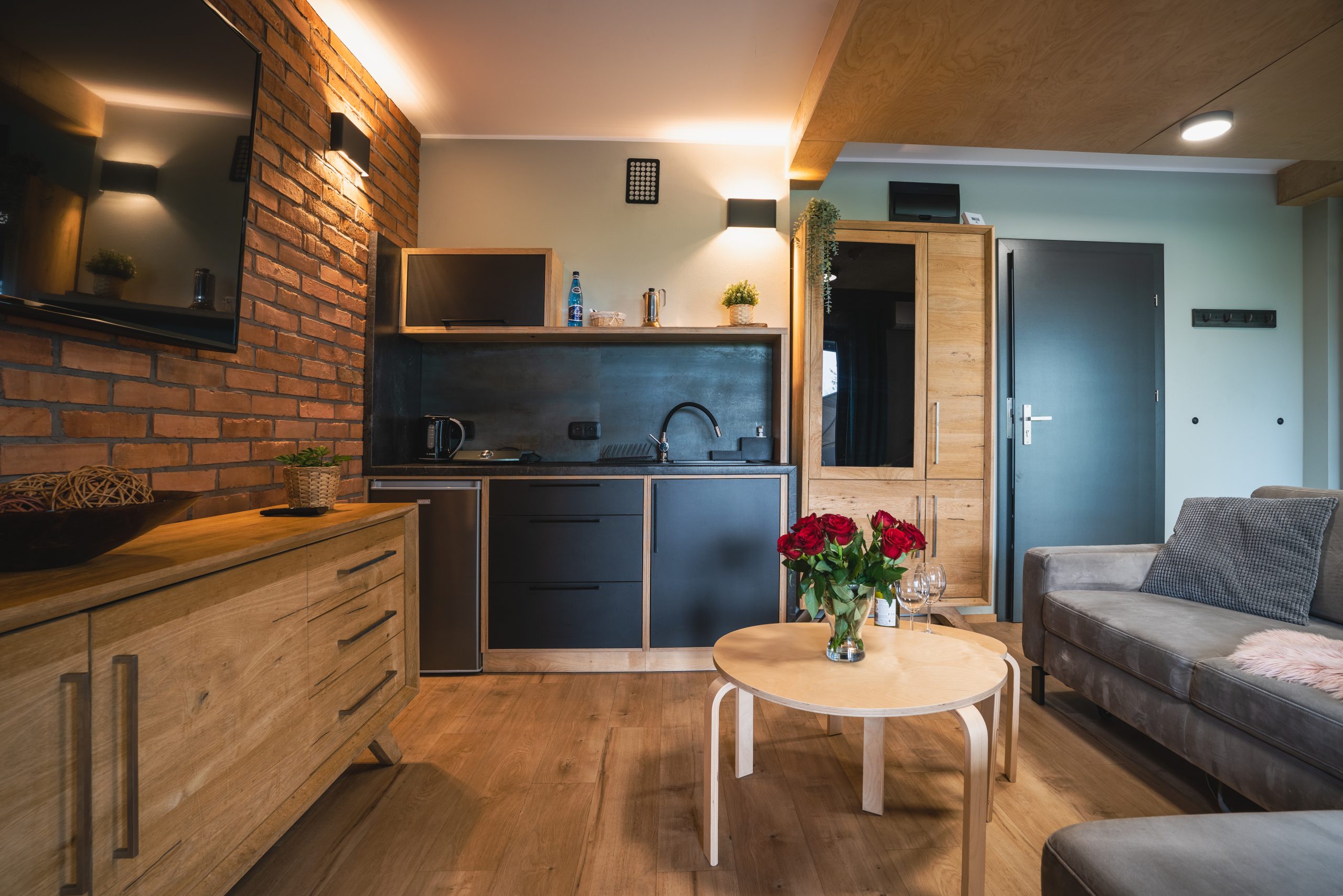 Salon oferuje wygodną, przestronną sofę, która zachęca do odpoczynku. Obok niej znajduje się stylowy stolik kawowy, na którym można postawić filiżankę ulubionej kawy lub wina. Duży, nowoczesny telewizor zapewnia rozrywkę podczas pobytu. W aneksie kuchennym znajdziesz wszystkie niezbędne udogodnienia, takie jak lodówka, czajnik oraz zestaw do parzenia kawy i herbaty, co pozwoli Ci przygotować coś pysznego w każdej chwili.