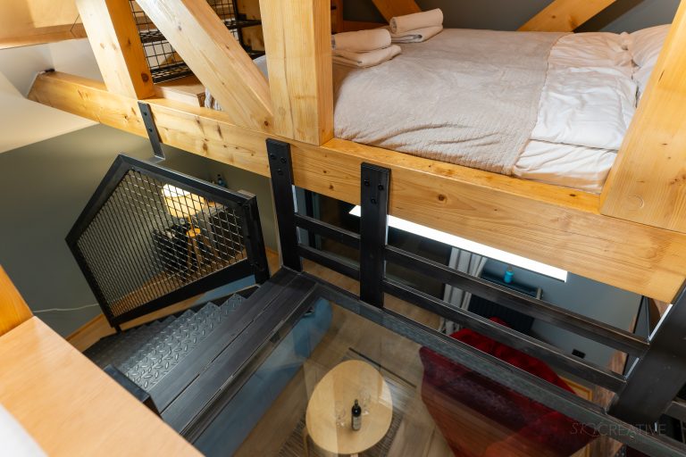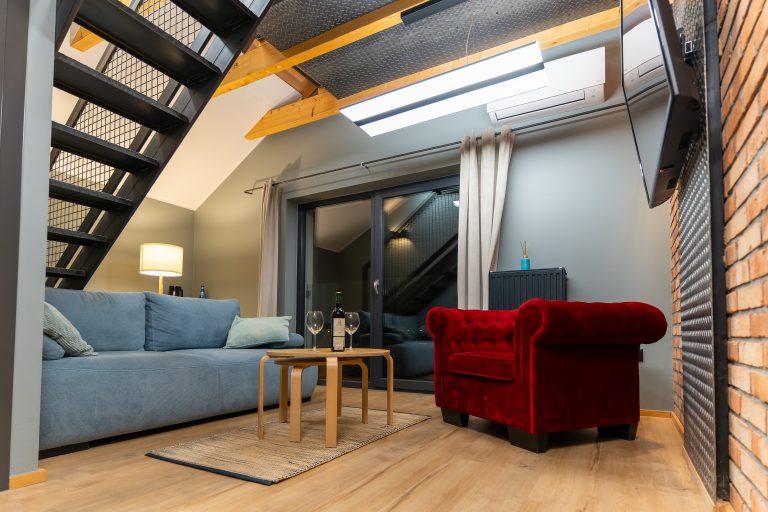 Apartament jest podzielony na dwie funkcjonalne strefy – przestronny salon z wygodną sofą, eleganckim fotelem w głębokim odcieniu czerwieni oraz minimalistycznym stolikiem kawowym, a także antresolę z sypialnią. Drewniane wykończenia w połączeniu z metalowymi elementami schodów oraz przeszklonymi detalami tworzą nowoczesną przestrzeń o unikalnym charakterze.