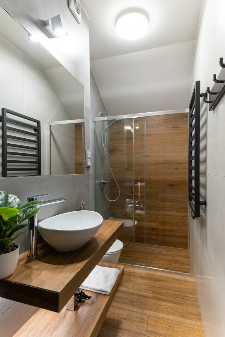 Łazienka została zaprojektowana z myślą o komforcie, oferując kabinę prysznicową typu walk-in z wykończeniem w ciepłych, drewnianych tonacjach, a także elegancką umywalkę na drewnianym blacie.